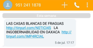Expusieron los números telefónicos de donde envían los mensajes son: 951 260 2000, 951 229 4612, 951 251 5442, 951 310 7525, 951 235 7513, 951 547 7429, 951 250 7233, 951 130 5987, 951 129 4726, 951 304 0221, 951 116 2749, 951 136 0666, 951 259 5273, 951 180 4543, 951 222 7004, 951 304 0221, 951 103 4869, 951 223 1543, 951 306 6078, 951 241 1878, 951 127 1683, 951 222 0276, 951 252 8229, 951 311 1642, 951 119 3511, 951 284 8760, 951 274 5507, 951 237 6741, 951 440 22 33.